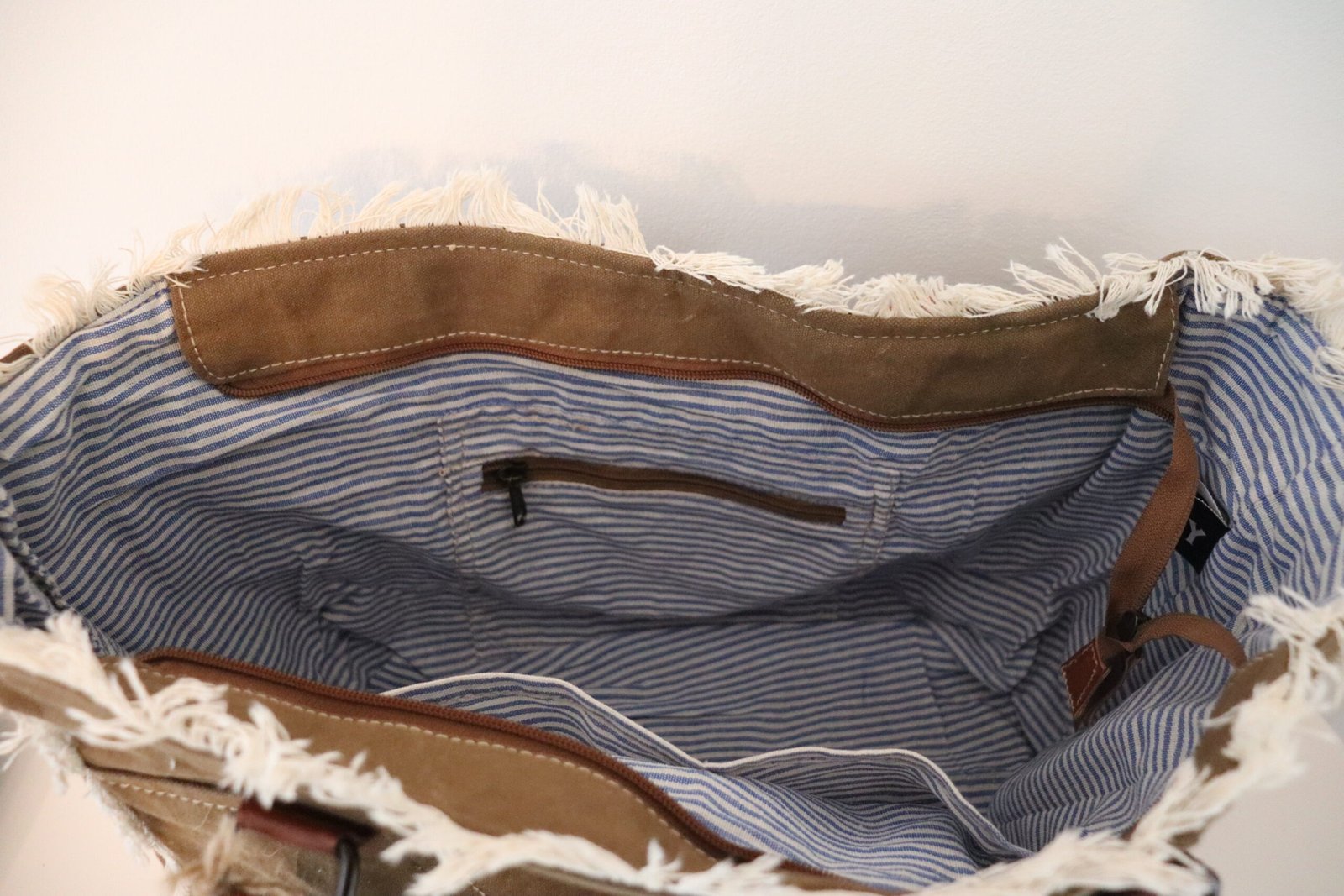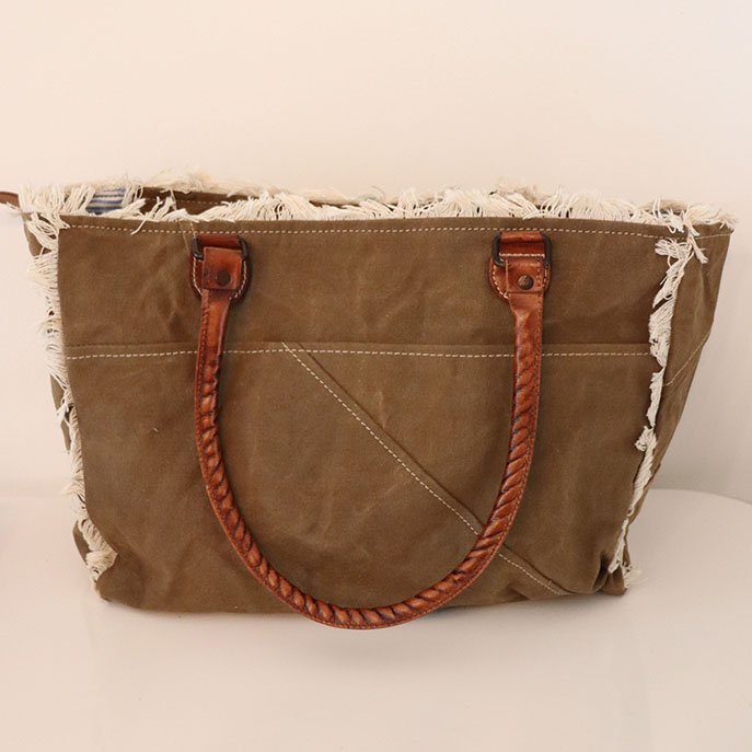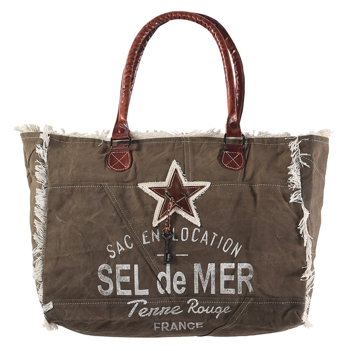 Sac cabas Sel de Mer en toile kaki au style vintage, avec anses en cuir et finitions effilochées.